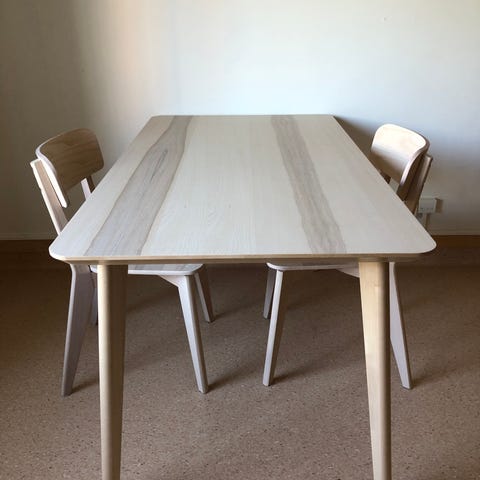 Matgrupp med 4 stolar och ett bord med 2 iläggsskivor, i massiv ek.