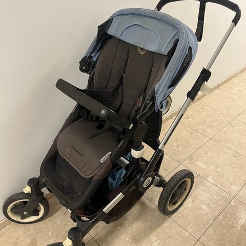Bugaboo barnvagn i svart tyg. Vagnen har sittdel, justerbart handtag och avtagbar frontbygel. Det finns en varukorg under sittdelen för förvaring. Med vagnen följer en svart liggdel. Klädsel och textilier är i mörk färgton, sufletten är solblekt. Frontbygeln visar tecken på slitage i överdraget enligt bild. Dragkedjan på liggdelen är trasig, se bild. Hämtas i Sköndal.