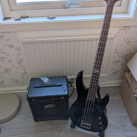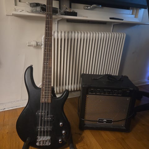 Kroppen har sunburst-finish och halsen är utrustad med standard stämskruvar i metall. Passar för elförstärkt spel i olika musikstilar. Basen kommer med 35W basförstärkare.