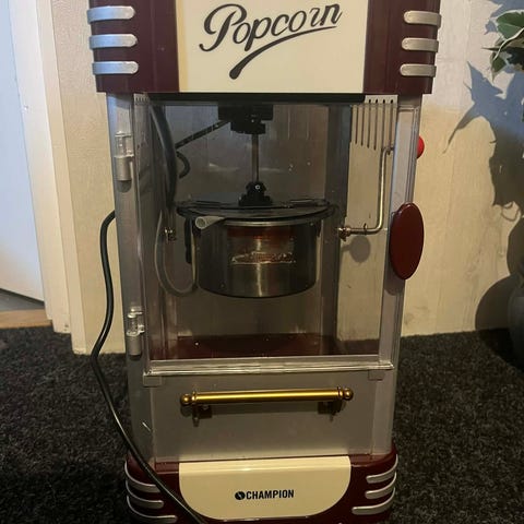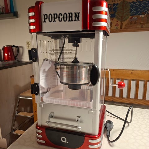 Andersson popcornmaskin bänkmodell. Popcornmaskin för hemmabruk med klassisk biografdesign. Utrustad med uppfällbar kastrull i metall, omrörare och genomskinliga väggar som gör det enkelt att följa tillagningen. Maskinen placeras på bord eller bänk och ansluts med vanlig elkabel. Lämplig för tillagning av popcorn vid exempelvis filmkvällar eller andra tillfällen i hemmet.