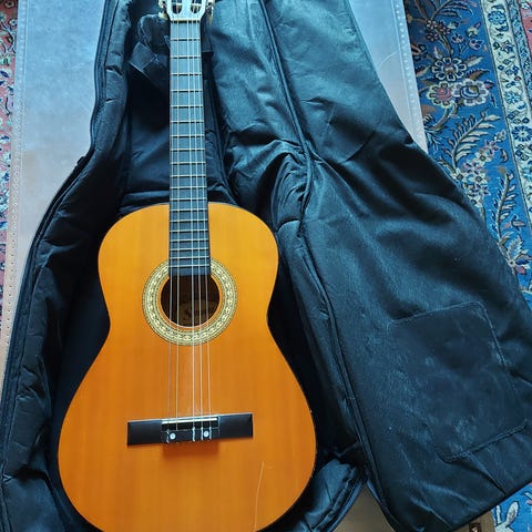 Akustisk gitarr av klassisk modell med nylonsträngar. Medföljer vadderat svart gigbag/fodral med flera ytterfack och bärhandtag. Passar för övning och spel i hemmet eller på resor. instruktions‑DVD för gitarrspel som kan ingå som tillbehör om säljaren önskar.