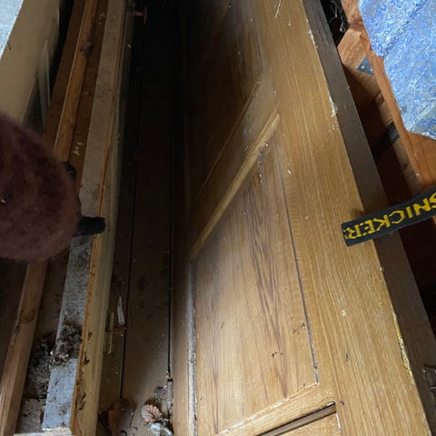 En trappa som stått inomhus upp till vinden. Just nu är det kö på trappan. Vi behöver först se så vi för ner trappan hel och ren innan någon kan hämta den