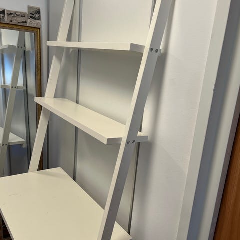 En hylla i ljusgrön färg med fem hyllplan. Hyllan är fristående och kan användas för förvaring eller som en dekorativ möbel. Den har en enkel design som passar i många olika rum