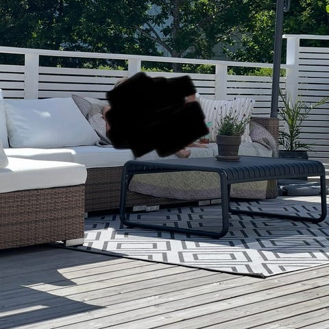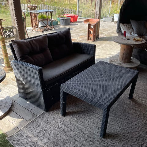 Soffa och soffbord för utomhusbruk i svart konstrotting. Soffan består av två moduler. Tillhörande rektangulärt soffbord med glasskiva upptill. Dynor ingår.