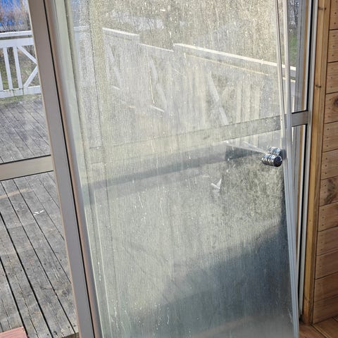 Glasdörren har träram, gångjärn och handtag samt tröskel. Dörren är avsedd för montering i bastuöppning och släpper igenom ljus samtidigt som den håller värmen inne.