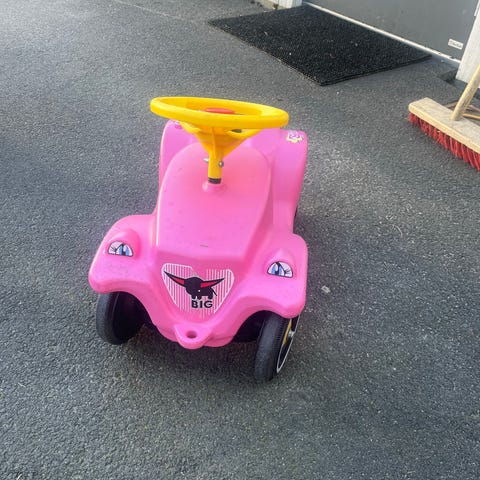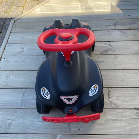 BIG Bobby Car gåbil i blå plast med svart ratt och vita hjul med orange detaljer. Lämplig som leksaksfordon för mindre barn att sitta på och ta sig fram genom att sparka med fötterna. Passar för användning både inomhus och utomhus på plana underlag.