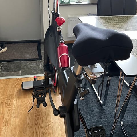 Spinningcykel / Träningscykel med justerbart styre och sadel. Utrustad med remdrift och stort svänghjul (ofta är svänghjulen mindre på cyklarna för hemmabruk) för en bättre känsla när man cyklar. Passar för inomhusträning och konditionsträning i hemmet. Pedaler med remmar för stabilitet vid användning.