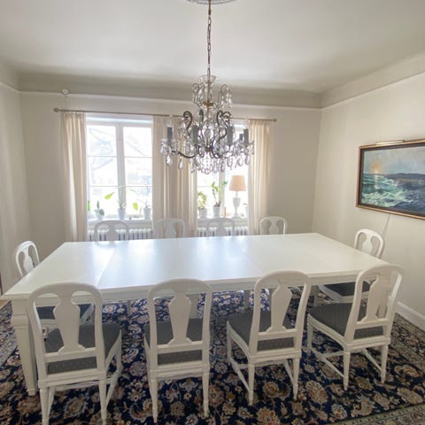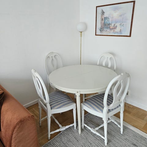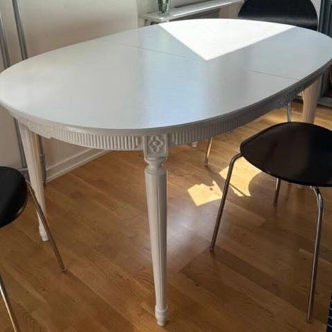 Gustaviansk matsalsbord ovalt 100x142 cm äldre , antikvit 2st ilägg med sarg på skivan2x50 cm tot längd med skivor 242cm 6 st stolar ny renoverade med ny klädda sitsar mm i mycket fint skick pris 9800kr flera delar finns i samma serie vid intresse ring 0762784109
