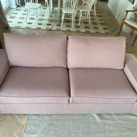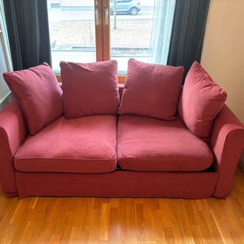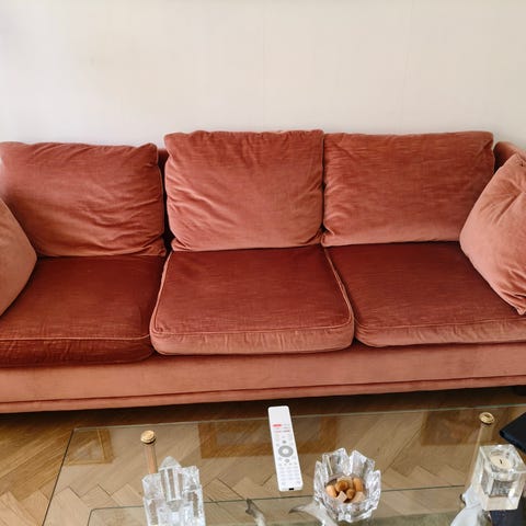 Köpt i London, stabil och av god kvalitet, kuddar fyllda med dun, bra tyg. Utan ben, en tuggummifläck, se bild.
