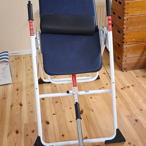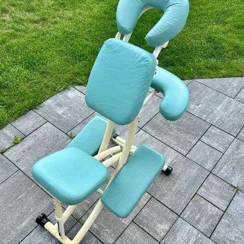 Idé & Hantverk massage-/behandlingsstol i trä med grå vadderad klädsel. Stolen har flera justerbara kuddar för knä, bröst, armar och huvud för att ge stöd i olika behandlingspositioner. Stått länge på vinden.