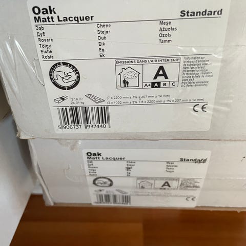 Någon som har kvar förpackningar av :Tidigare sortiment av parkettgolv Linnea Ek/Ask från Kährs. Ek med en så kalla pyntefog i ljus ask. Bredd cirka 18 cm tunnparkett 7 mm Så kallat skeppsgolv puntefogen 10 mm