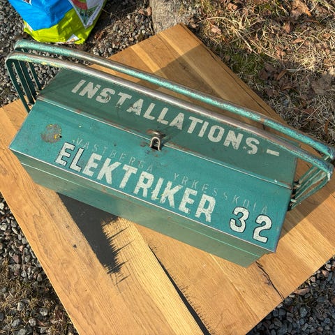 Verktygslåda i grå metall med bärhandtag och uppfällbara fack. Lådan har flera fack för sortering av verktyg och tillbehör. Passar för förvaring och transport av handverktyg i garage, verkstad eller vid arbete utomhus.