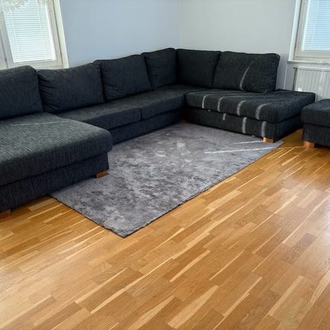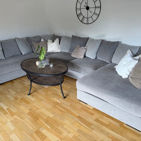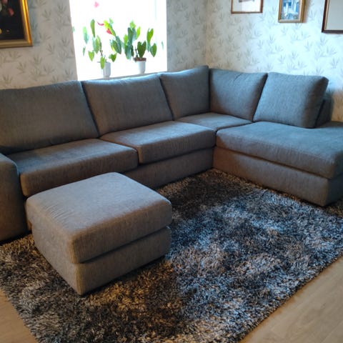 Rymlig mörkgrå soffa. L-formad i ena änden och diagonal i andra änden. När man sitter i den är diagonalen till höger och L formen till vänster.