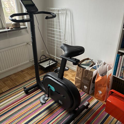 motionscykel i svart utförande. Cykeln har justerbart säte och styre för att kunna anpassas efter användarens längd och sittposition. Pedalerna är utrustade med remmar för att hålla fötterna på plats under träning. Motståndet är steglöst justerbart med ett reglage på ramen, vilket gör det möjligt att variera intensiteten. Cykeln är avsedd för inomhusträning och passar för konditionsträning och cykelpass i hemmet. Måtten är cirka 100 cm i längd och 125 cm i höjd enligt produktbilden.