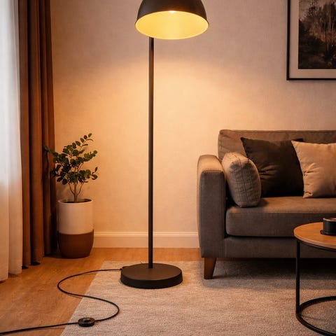 Ikea Hektar golvlampa i mörkgrå metall. Lampan har en rund fot och en riktbar lampskärm som ger riktat ljus, lämpligt till exempel vid soffa eller fåtölj. Strömbrytare sitter på sladden vid golvet. Max effekt enligt märkning är 53 W. Avsedd för inomhusbruk och anslutning till 110–240 V, 50–60 Hz.