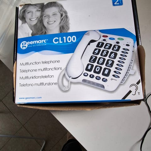 Geemarc AmpliPOWER 50 bordstelefon med stora knappar i vit färg. Telefonen har tydliga, extra stora sifferknappar och funktionsknappar för snabb åtkomst till bland annat volymkontroll och minnesknappar. Modellen är förstärkt upp till 60 dB enligt förpackningen och är avsedd för fast telefoni. Med följer lur, spiral- och anslutningssladdar samt bruksanvisningar på flera språk. Lämplig för användare som önskar tydlig knappdesign och justerbar ljudnivå.