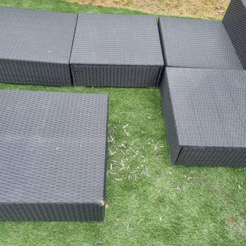 Utemöblemang med fotpall och soffbord med glasskiva. Dynor ingår. Dock solblekta.