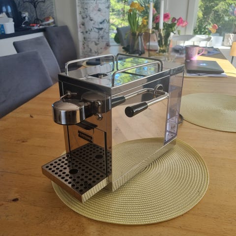 OBH Nordica elektrisk skoputsmaskin med flera roterande borstar för rengöring och putsning av skor. Maskinen har en separat behållare för skokräm samt en gummimatta undertill för att samla upp smuts. Behöver refill av skokräm.
