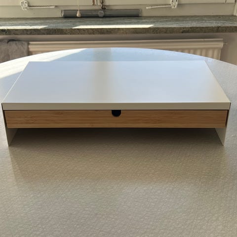 Passar att placeras på skrivbord eller bänk för att höja skärm eller laptop.