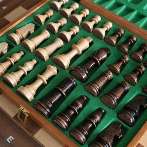 Resespel set med schackbräde och mahjongbrickor i väska. Schackbrädet är hopfällbart och fungerar som förvaringslåda. Mahjongsetet innehåller brickor med tryckta symboler och markeringspinnar. Förvaras i en bärbar väska med handtag, lämplig för spel hemma eller att ta med på resa.