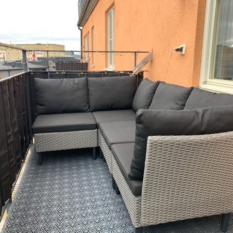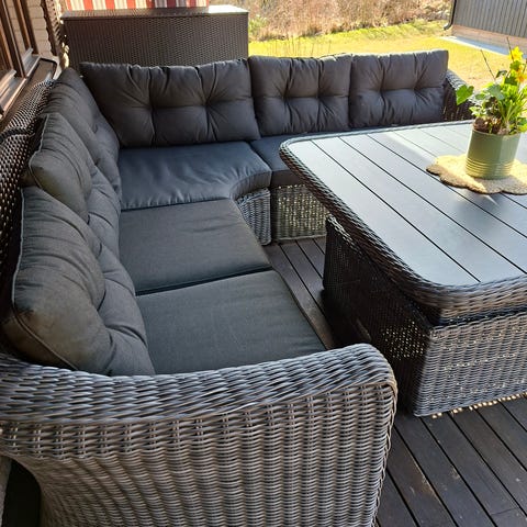 Hörngrupp utemöbler i konstrotting med bord i rektangulär form. Soffdelen som är svart består av flera moduler som bildar en hörnsoffa med sits- och ryggdynor som är något solblekta, mörkgrå när dom var nya.