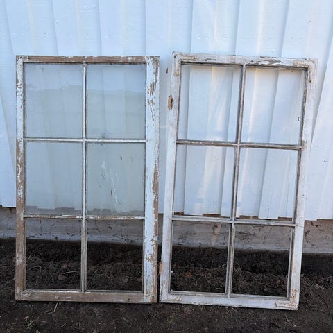 Träfönster med spröjs i vitmålat trä. Fönstren har enkelglas och klassisk indelning med två respektive tre rutor. Passar exempelvis till renovering av äldre hus, friggebod, växthus eller som inredningsdetalj. Mått framgår delvis av bild med måttband; övriga exakta mått behöver mätas på plats.
