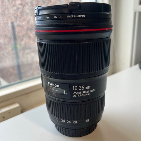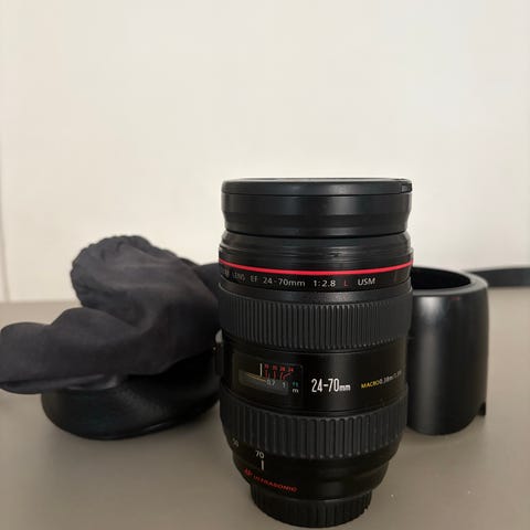 Canon EF 24-70mm f/2.8L II USM zoomobjektiv i svart. Brännvidd 24–70 mm med konstant största bländare f/2,8. Objektivet tillhör Canons L-serie och har USM-motor för snabb och tyst autofokus. Passar Canon-kameror med EF-fattning. På bilderna syns objektivlock och mjuk väska från Canon som kan ingå om de följer med vid försäljning.