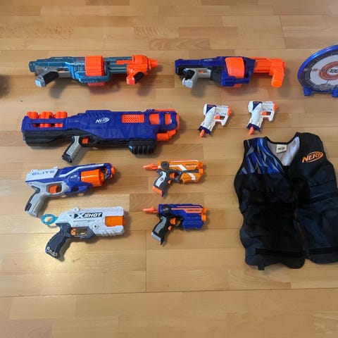 Nerf leksaksvapen set i plast med flera delar och tillbehör. Setet innehåller större och mindre leksaksvapen i färgerna orange, grå, vit och inslag av grönt, samt lösa magasin och pilar. Passar för lek med skumprojektiler inomhus eller utomhus. Alla delar är avsedda som leksaker för barn och ungdomar, med lätt konstruktion i plast och tydliga signalfärger.