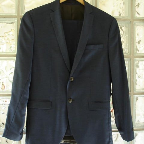 Kostym för herr i storlek 48. Kostymen är blå och tillverkad i polyester. Modellen har slag med krage, två knappar framtill, två framfickor med lock samt bröstficka. Invändigt finns fodrad insida med innerficka. Slimfit.