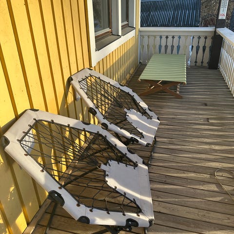 2st solstolar, går att fälla ihop. Ryggstödet kan justeras genom metallbygel på baksidan.