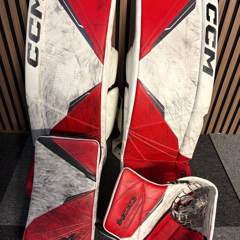 CCM AXIS målvaktsutrustning bestående av benskydd, plock och stöt. Storlek på benskydden är 33+1. Färgkombination i blått, vitt och rött (New York). Benskydden i ok skick, handskarna klart slitna och kan behöva fixas (innerhandsken på stöten har hål).