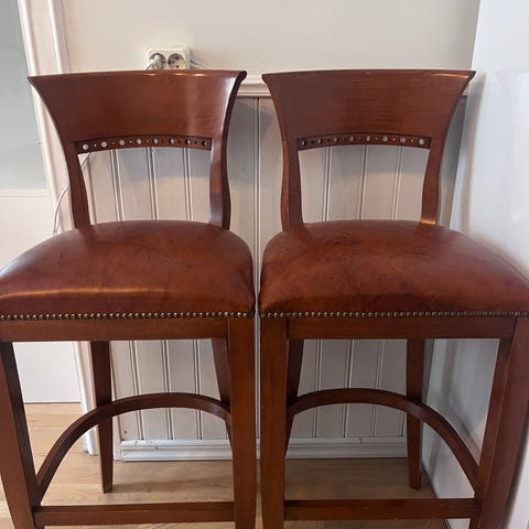 IKEA två barstolar med klädd sits och ryggstöd i svart konstläder och ben i mörkt trä. Stolarna är utformade för användning vid köksö eller barbord och har fotstöd för ökad sittkomfort. Passar i kök, matplats.