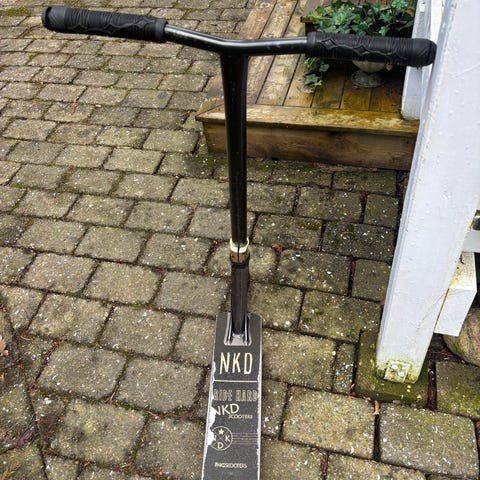 NKD sparkcykel avsedd för trickkörning. Modellen har ett styre i svart med greppvänliga handtag och ett deck i regnbågsfärgad metall med grovt griptape för bättre fotfäste. Framgaffel och hjul har samma regnbågstonade finish. Lämplig för användning i skatepark eller på plana underlag där en kompakt trickmodell önskas.