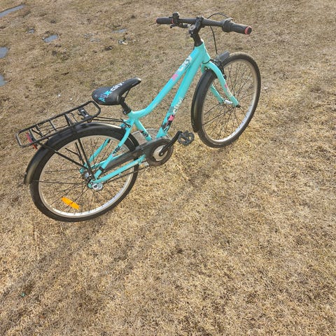 City barncykel med 24" hjul i turkos färg. Utrustad med pakethållare bak, skärmar fram och bak, handbroms fram samt fotbroms bak. Cykeln har rak styre med ringklocka och belysning fram. 3 växlar. Passar barn som vuxit ur mindre barncyklar och behöver en cykel med 24-tums hjul för vardagscykling till skola och fritidsaktiviteter.