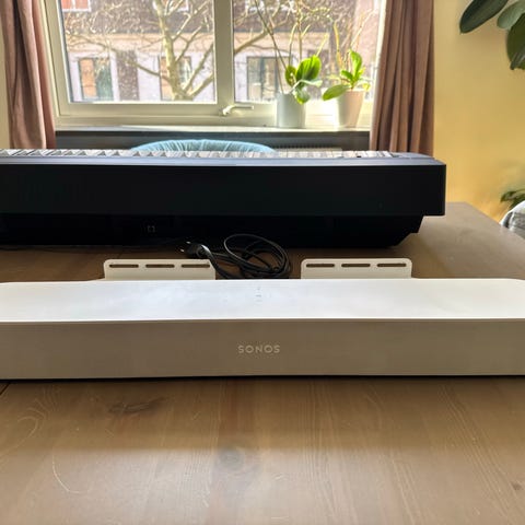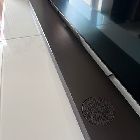 Soundbaren är utformad för användning tillsammans med TV eller annan ljudkälla och kan placeras på bänk eller monteras under en skärm. Modellen har ett tygklätt yttre och en centrerad öppning på framsidan för högtalarelement och anslutningar.