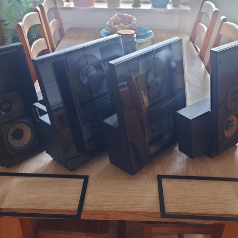 Bang & Olufsen stereopaket med fristående enhet och tillhörande fjärrkontroll. Enheten har front i glas med grafiskt mönster och är avsedd för användning som del av ett hemmaljudsystem. Stereopaketet ansluts med kabel till övrig ljudutrustning och kan placeras på bord eller hylla. Passar för uppspelning av ljud i hemmamiljö där kompakt format önskas. fungerar bra med dörrarna öppnar sig inte , går att dra upp för hand eller fixa med service , högtalarna kan köpas till Beolab 6000 (ingår inte)