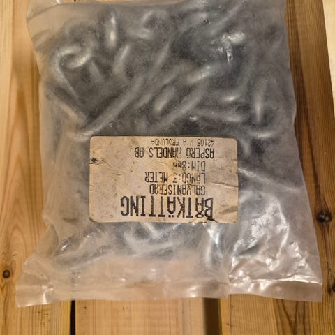 Oanvänt galvaniserad kätting med diameter på länkar 8 mm och längd cirka 5 meter. Lämplig ex.vis för dragg/ankare vid akterförtöjning. Kättingen ligger i orginal plastpåse.(förslag : kan lämnas vid Amhult/Backaplan i Göteborg, pga vikt)