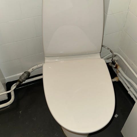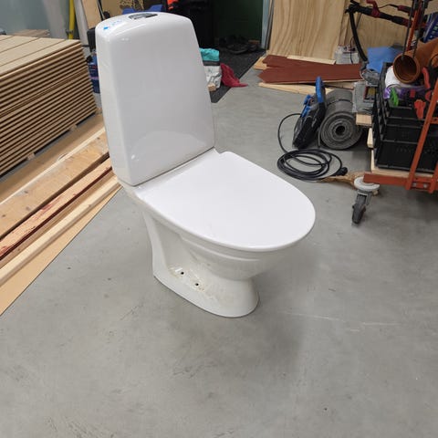 Toaletten är en kombimodell med cistern och sittring i ett stycke. Spolning sker via knapp ovanpå cisternen. Avloppsanslutning sker mot golv och vattenanslutning bak på cisternen. Passar för installation i badrum eller toalettutrymme där en golvstående wc-stol önskas. Säljes pga renovering.