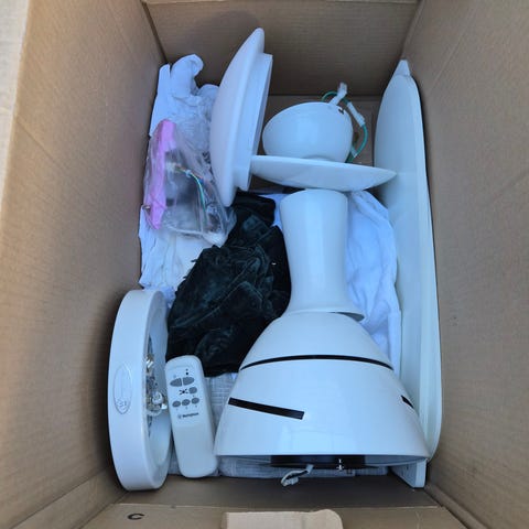 Hunter Industrie takfläkt med tre blad. Fläkten har ett metallhölje i borstad/kromad finish och utbytbara blad i två utföranden: träfärgad sida och grå sida. Märkdata enligt etikett: modell Industrie, 230–240 V, 50 Hz, 100 W. Avsedd för takmontering inomhus, exempelvis i vardagsrum, kök eller större rum där man vill cirkulera luften effektivt. Levereras utan synliga tillbehör på bilderna utöver själva fläkten med motorhus och blad.