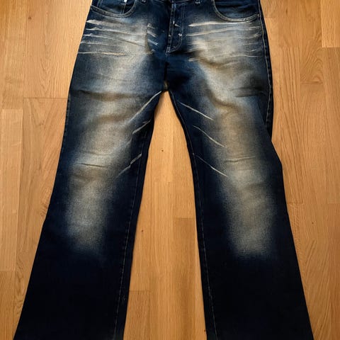 Svarta Jeans storlek 36/34 med knappgylf. Lite slitage längst ner vid byxkanten, se bild. Överlag gott skick annars. Det ser ut som en reva/lagning på första bilden på benen, det är bara ett veck då de legat i byrån, se sista bild för jämförelse.