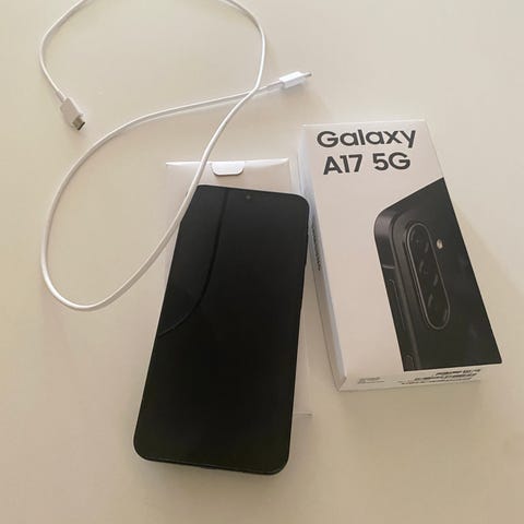 Samsung Galaxy A17 5G mobiltelefon med 128 GB internminne. Modellen tillhör Galaxy A-serien och stödjer 5G-uppkoppling. Lagringsutrymmet på 128 GB ger plats för appar, bilder, videor och andra filer. Telefonen levereras i originalförpackning enligt bilderna och är avsedd för allmän användning som samtal, meddelanden, surf och mediekonsumtion.