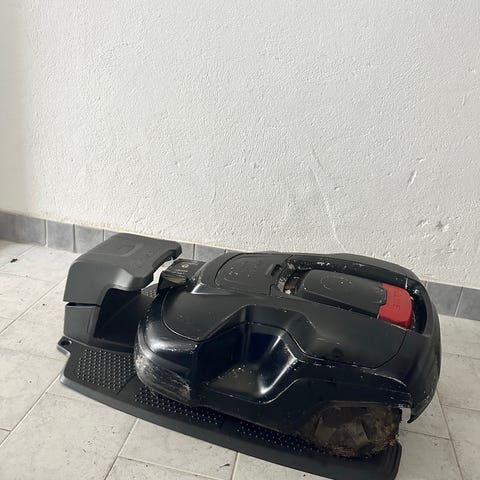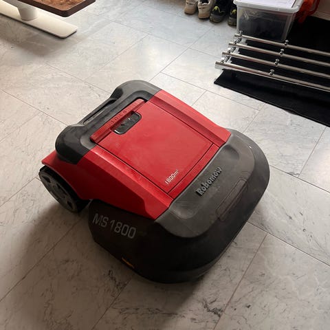 Honda Miimo HRM 310 robotgräsklippare i vit färg. Modellen är avsedd för automatisk klippning av gräsmatta inom ett avgränsat område med begränsningsslinga. Enheten har inbyggd kontrollpanel med display för inställning av klipptider och funktioner. Till robotgräsklipparen hör skyddskåpa/garage samt användarhandbok för modellerna HRM 310/520. Lämplig för privat trädgård där man önskar regelbunden, automatiserad klippning av gräsmattan.