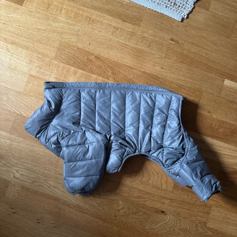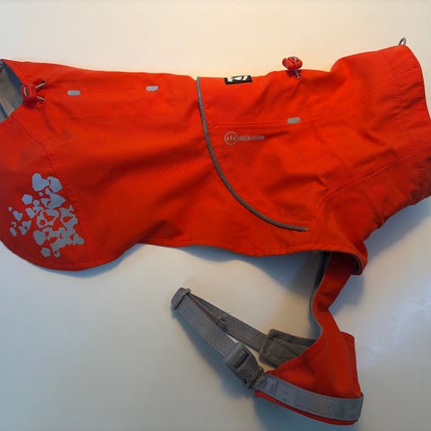 Hurtta hundtäcke i storlek 55 cm. Yttertyg i 100 % polyester och foder i 100 % polyester. Färgen är grå med ljus insida och mönsterdetaljer. Täcket har öppning för sele eller koppel och justerbara remmar för att kunna anpassas efter hundens kropp. Passar för att skydda hunden mot väder och vind vid promenader och utevistelse.