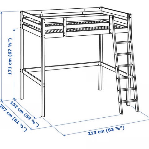 IKEA loftsäng i svart utförande (var vit, men har målat den svart i NCS S 8500-N). Sängen är upphöjd med stege på sidan och ger utrymme under för exempelvis skrivbord, förvaring eller sittplats. Passar standardmadrass för 140x200. Konstruktion i trä med skyddskanter runt bäddytan för att hålla madrassen på plats. Resårmadrass ingår och nyinköpt början av 2025.