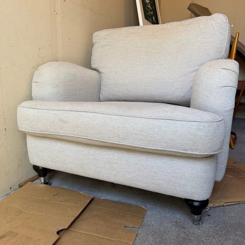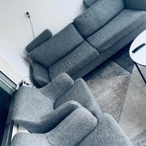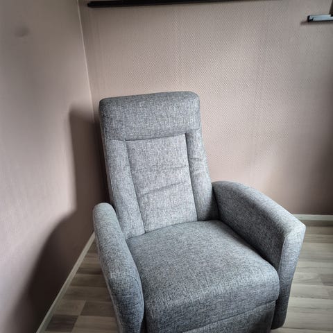 Bekväm fåtölj, men jag behöver utrymmet till annat :-) Tyget är i mycket gott skick, och motorn till fotstödet fungerar strålande men ger ifrån sig ett litet "grymt" om man fäller in det helt.