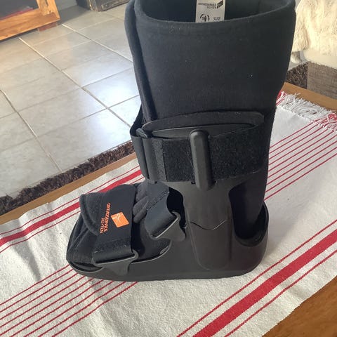 Ortosen är ett fotledsstöd i grå färg med justerbara remmar och hård plastkonstruktion. Den är avsedd att ge stöd och stabilitet för fotleden vid skador eller rehabilitering.