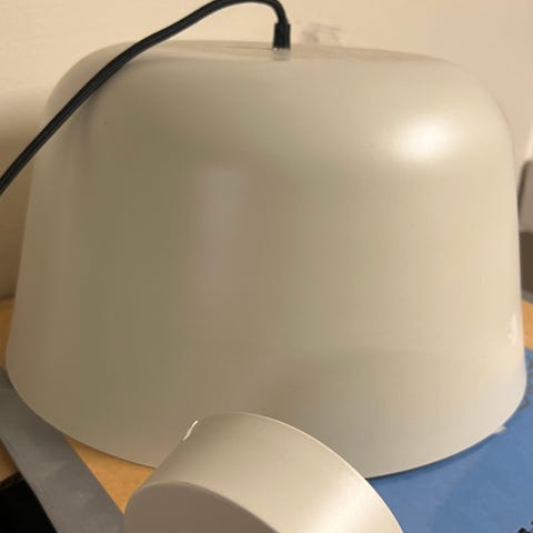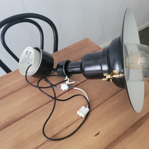 IKEA taklampa med tre riktbara spotlights i svart metall. Lampan är rund med tre cylindriska lamphuvuden i perforerad metall och detaljer i mässingsfärg. Avsedd för montering i tak och ansluts med stickkontakt. Passar för flera typer av rum där riktat ljus önskas, till exempel kök, hall eller vardagsrum. Ljuskällor av spotlight-typ används, anpassas efter armaturens sockel och maxeffekt enligt märkning på lampan.