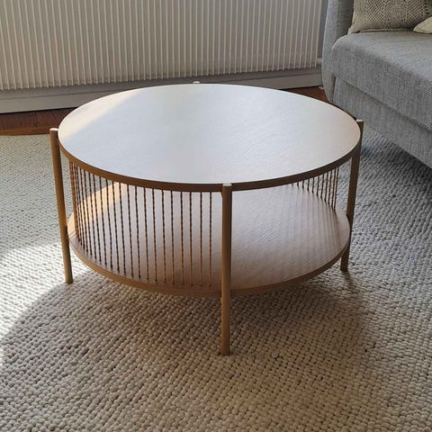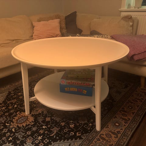IKEA soffbord i träfaner med två nivåer. Bordet har en övre och en nedre skiva som ger extra avställningsyta. Rektangulär form med öppet utrymme under den övre skivan som kan användas för förvaring av till exempel tidningar eller fjärrkontroller. Lämpligt som soffbord i vardagsrum eller som sidobord i annan del av hemmet.