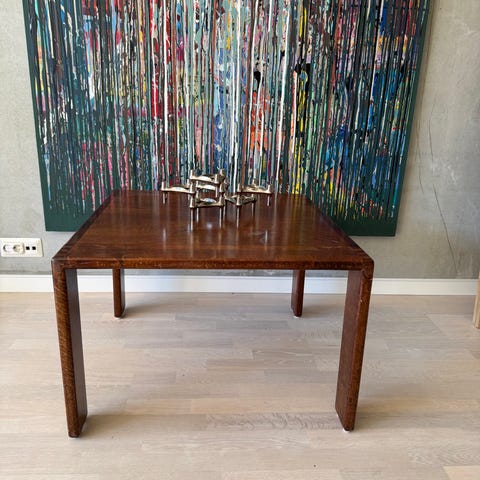 Bord som går att justera i höjd och storlek på skiva. Otroligt vackert bord som kan användas som både soffbord (min höjd 60 cm) och matbord (maxhöjd 75 cm)