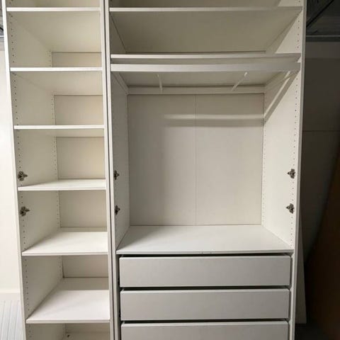 Öppen garderob med platsa från ikea i vitt stål.